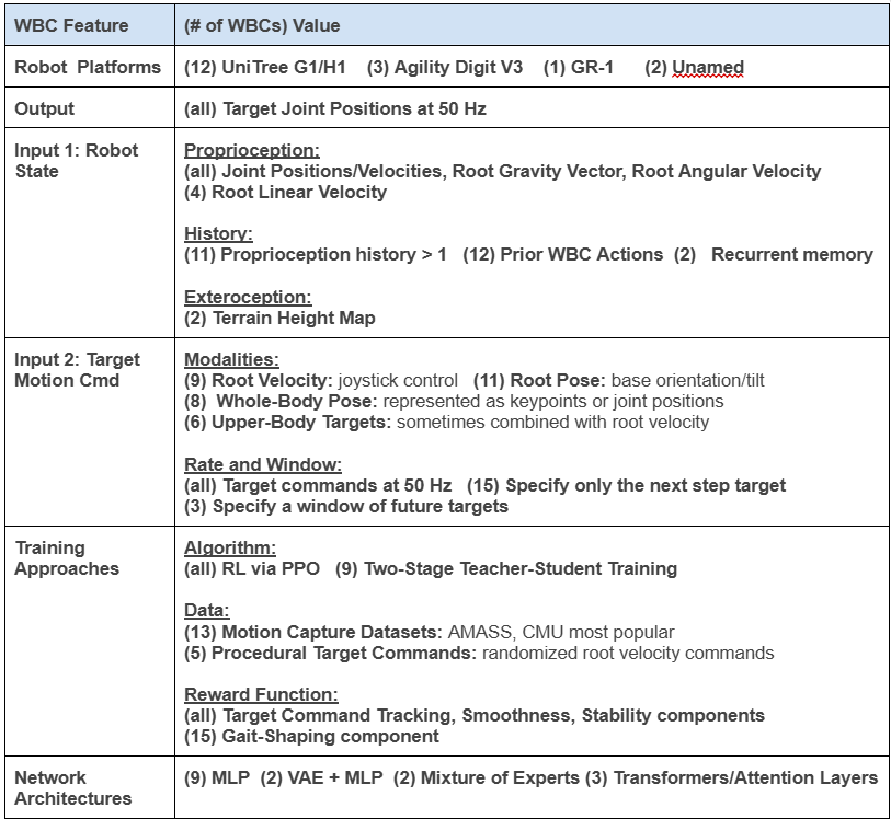 Table 1 presents a coarser view of the spreadsheet data that covers the key aspects of WBCs discussed in this post. In the following sections, I’ll walk you through this table from top to bottom. My goal is to provide both a light tutorial on how these RL-trained WBCs are built and operate, and to highlight some trends and gaps that emerge from the current landscape.