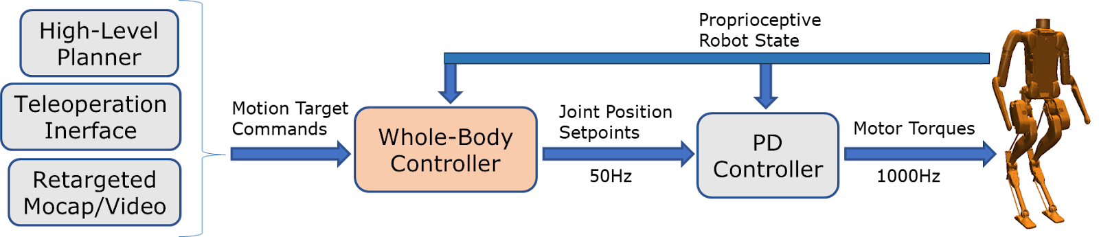 This pattern of producing joint setpoints at a moderate rate, stabilized by a high-rate PD layer, has become the default template for learned humanoid WBCs. It remains to be seen if this choice will reveal limitations, especially in applications requiring precise force control for manipulation.